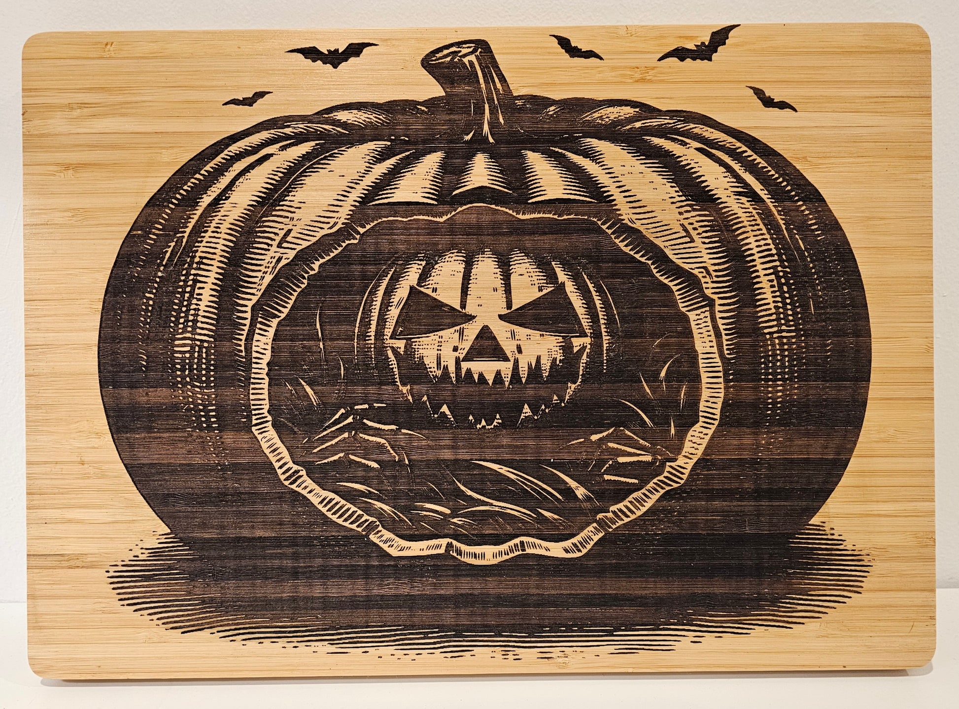 Bring a spooky touch to your kitchen or holiday décor with this beautifully engraved bamboo cutting board. Featuring a detailed jack-o’-lantern design within a pumpkin, complete with flying bats overhead, this piece is perfect for Halloween enthusiasts. The durable bamboo construction makes it functional for everyday use, while the haunting artwork also makes it a great display piece for seasonal decoration.