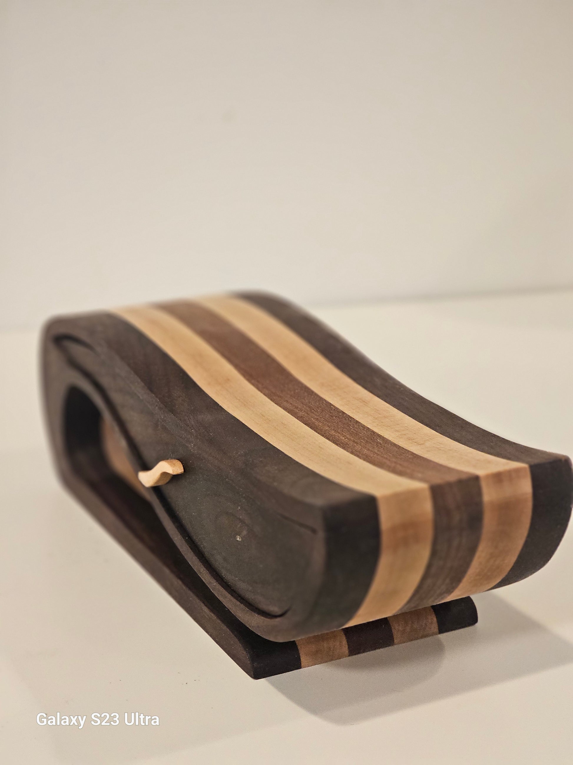Bring artistry and function together with this unique handcrafted bandsaw box. Designed in a sleek wave shape, this piece showcases the natural beauty of layered woods in light and dark tones. The pull-out drawer, accented with a light wood handle, makes it perfect for storing jewelry, keepsakes, or other small treasures.