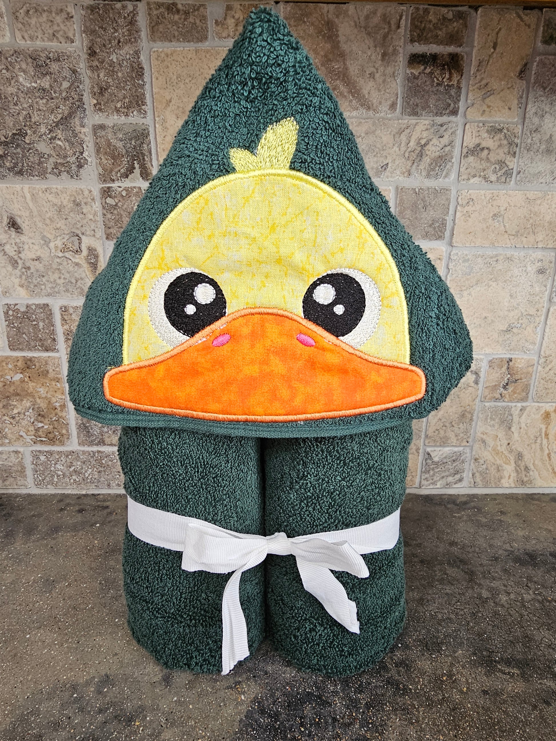 Wrap your little one in cuteness with our handcrafted Hooded Duck Towel Bundle! Made from ultra-soft, absorbent dark green terry cloth, this cozy towel features an irresistibly cute embroidered duck face with wide sparkling eyes and a bright orange beak. Perfect for bath time, pool days, or as a unique baby shower gift!