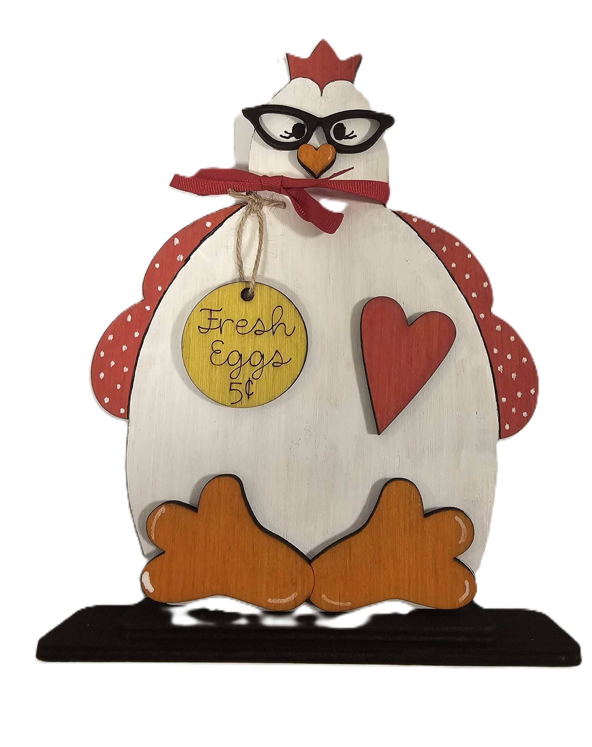 Add a touch of farmhouse charm to your kitchen or home with this adorable wooden chicken decor! Featuring a whimsical chicken design complete with polka-dotted red wings, stylish black glasses, and a heart-shaped accent, this piece is perfect for country-style lovers. A hanging yellow tag reads “Fresh Eggs 5¢,” making it a fun addition to your breakfast nook or egg stand. Finished with a red ribbon and sturdy black base, this hand-painted decor is both playful and eye-catching.