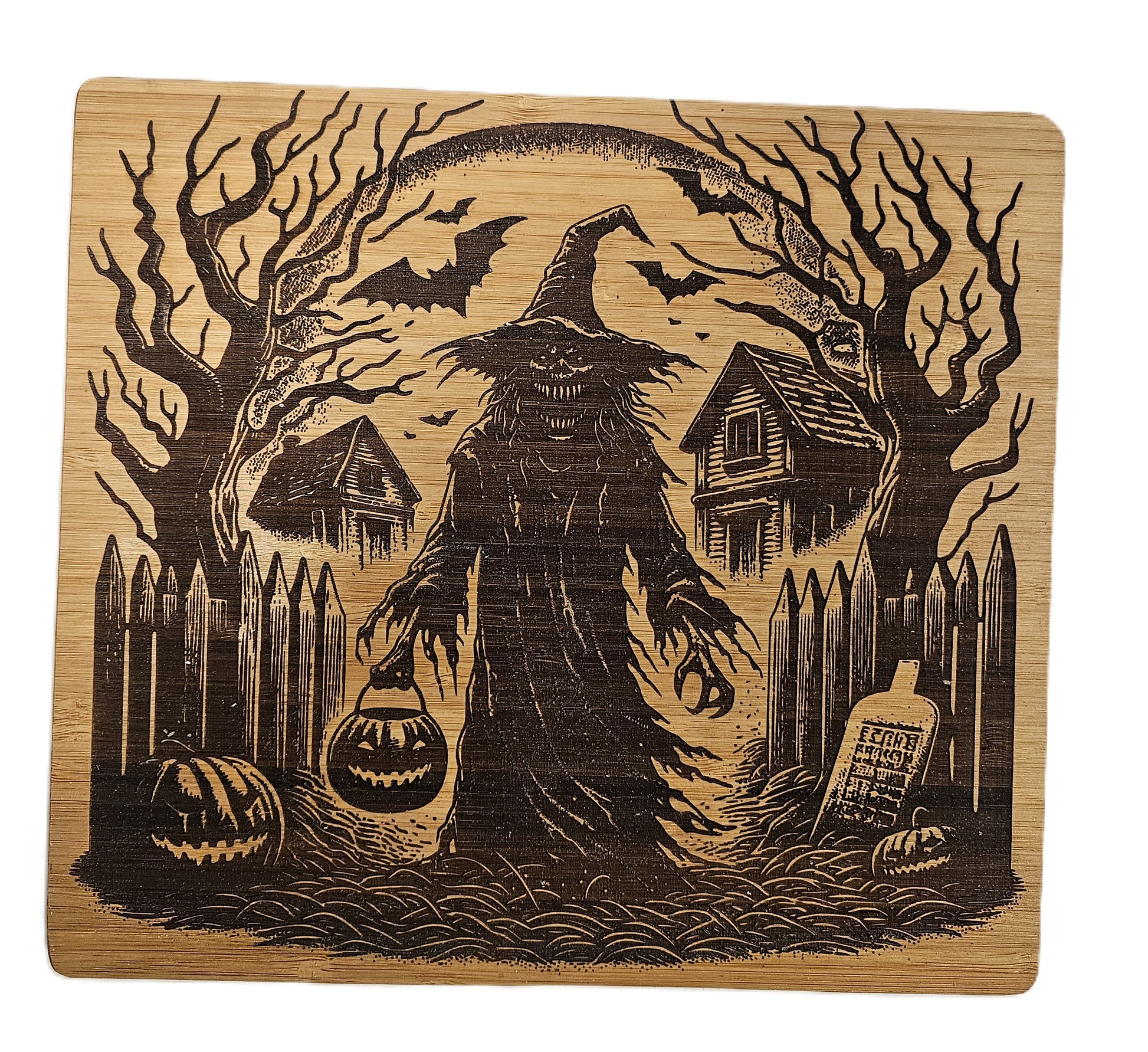 Just in time for the haunting season, this board will surely add to the season. Natural bamboo with a beeswax finish. the reverse side can be used as a cutting board. 11"x10"