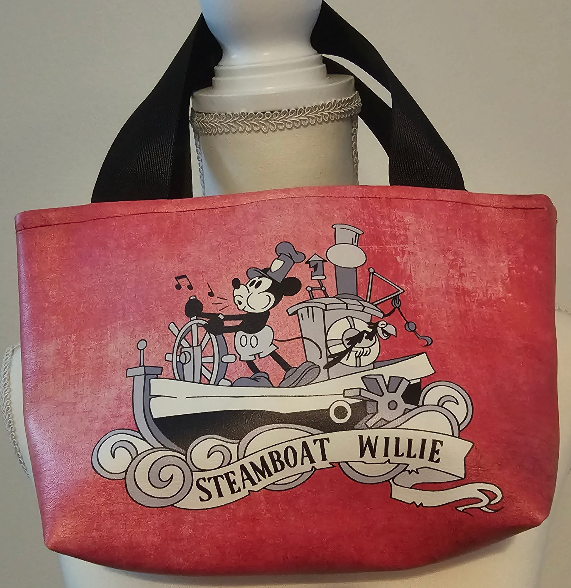 Carry a piece of classic Disney magic with this vibrant Steamboat Willie tote bag! Featuring the iconic black-and-white character steering his steamboat on a rustic red background, this bag is both nostalgic and functional.