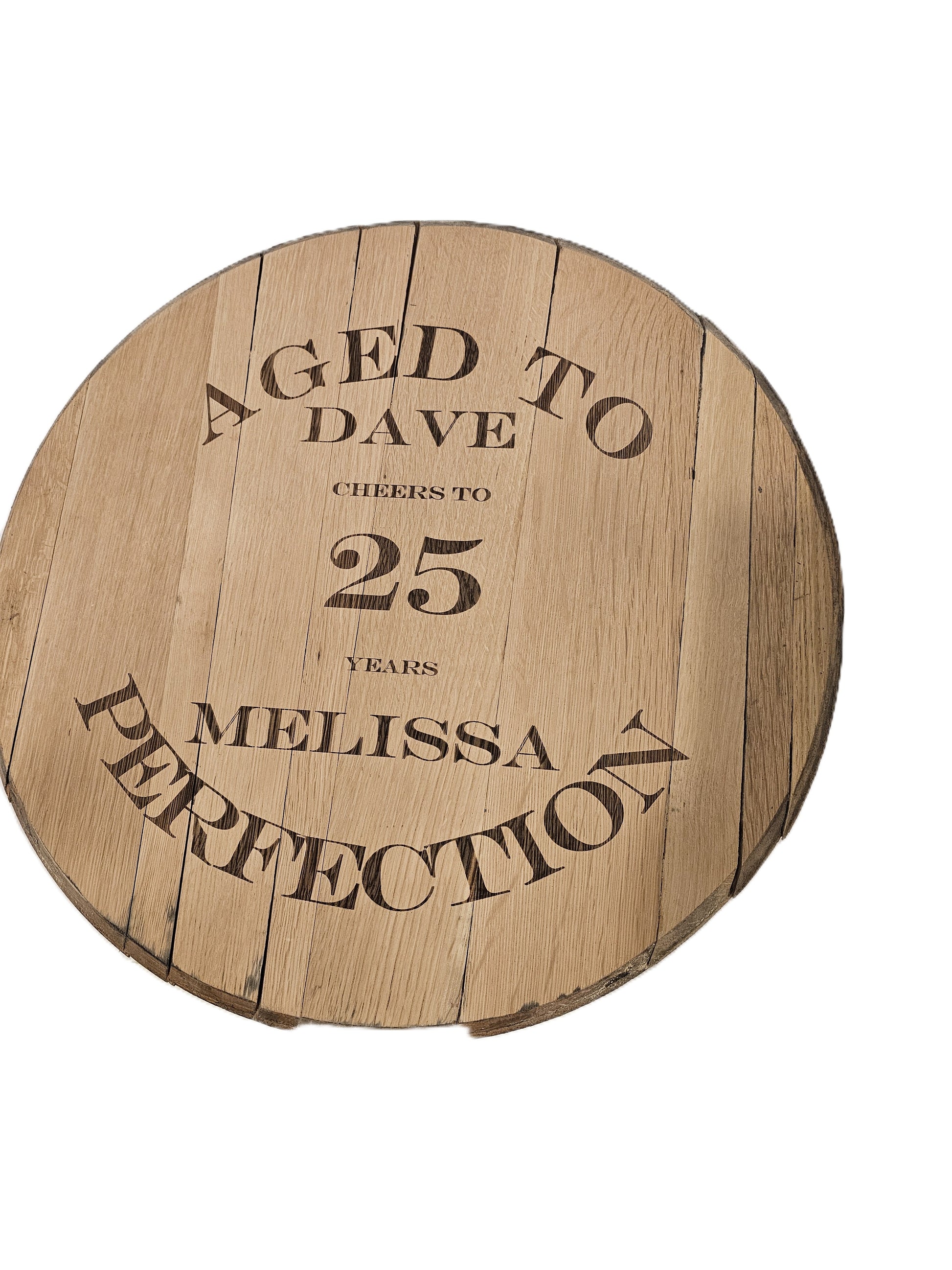 An authentic whiskey barrel lid engraved with the message of your choice. Currently have a supply from Jim Beam Distillery. The back side still shows signs of charring. These lids are from barrels used in distilling process and have imperfections. This item is special order only as it will be personalized, stained and sealed as requested. Please contact us via email for instructions. Allow 3-6 weeks for delivery. Price includes shipping.
